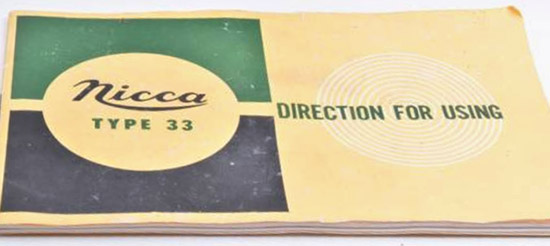 This would also explain the Nicca Type 33 user manual below. The Type 33, said to be the forerunner of the Yashica YE (to me, they are separate developments of the 3-F lever wind) is claimed to have been released in “early” 1958. User manual front cover: