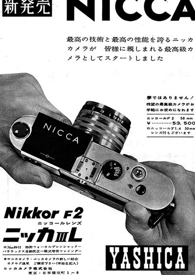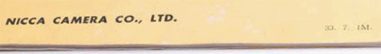 How long Type 33 sales continued is unknown but certainly not beyond the release of the Yashica YE and so far, there is no evidence of any Yashica involvement in marketing material. Most Japanese sites claim that the YE was released in March 1959 but Mikio Awano says January 1959 (reference to his article is in Lenses). From serial numbers, production seems to have gotten underway in December 1958. On the other hand, sales of the Nicca III-L model continued into 1959 beyond the Yashica YE release and and perhaps until the YF release later in the year.