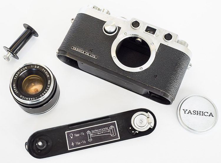The YF is different in appearance to the Nicca III-L but is basically the same camera without the Nikkor lens options and with a few small things deleted and some added. The YF was commonly supplied with a “Yashinon” f/1.8 5 cm lens, later called “Super-Yashinon” (see Standard YF 5 cm f/1.8 Yashinon & Super-Yashinon Lenses below) but sometimes is also found with a virtually unknown f/2 5 cm Yashikor which may have only been offered in Japan: