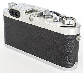 (For the record, early Leicas have a body length of 133 mm and height of 67 mm and the die-cast IIIc and IIIf are 135 mm by 69 mm, as measured by myself and IIIf owner Terry Byford, with a base plate width of 30 mm. Generally, the Japanese die-cast copies are a little bigger than the German original because, it has been claimed that the Japanese weren't quite as advanced with casting techniques at that point but in truth, the Japanese were probably not worried about a couple of millimetres if it could be more economically done. They were also probably not as finely attuned to the Barnack philosophy of keeping the camera as compact as possible. For comparison's sake, the knob wind Nicca 3-F is 448 grams, so a little heavier than the Leica IIIf but 24 grams lighter than the YE, or presumably a Nicca 3-F with lever wind).