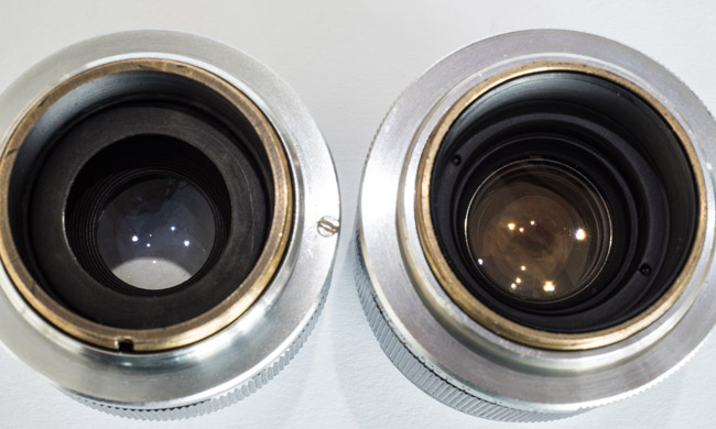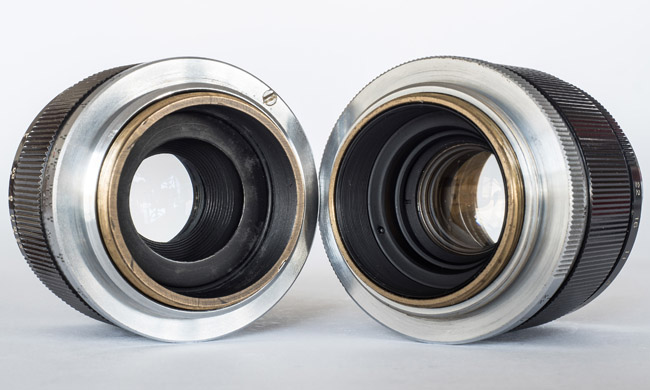 Who actually made the 5 cm lenses is a very complex question made more difficult by the existence of several different versions and no real evidence apart from design similarities. We don't know who made the Nicca lens, certainly not a top tier lens maker given the Type 33's target price. It's possible that Yashica/Nicca or Tomioka could have been responsible for the new barrel on the early “81” Yashikor, if that's all it was. If Tomioka was responsible for the new “91” lens, then there is a fair chance it delivered the Yashinon/Super-Yashinon also. As well as the family look, the tails of the Yashinon/Super-Yashinon seem to use a very similar rear group mounting design to the “91” Yashikor and the amber lens coatings are also shared. Rear of “91” Yashikor on left, rear of Yashinon on right: