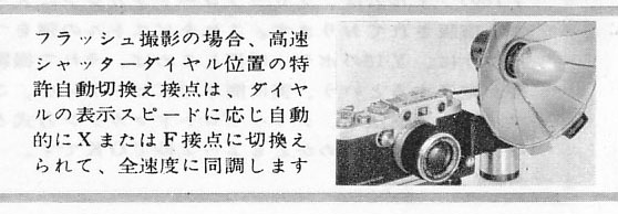 Most see the YE flash X sync speed reduction as a feature downgrade but it is more likely that the Type 33 introduced the higher speed as a consequence of cost cutting. Synchronised Nicca models up to this point had been able to sync FP bulbs at any speeds but X sync speeds were initially 1/20 and then 1/25 (i.e. also the speed separating the fast from slow speeds). According to a Japanese brochure, whilst X sync for the Type 33 was increased to 1/60, M and FP sync were limited to the slow speeds only, i.e. below 1/30 (a form of open flash as I understand it from the 3-F user manual). It seems that the sync speed changes were probably linked. X sync was easy (contacts tripped when both curtains were fully open) but this was not a good plan for customers at a time when electronic flash was inefficient, large with separate power packs and out of reach of most amateurs. The Yashica YE (confirmed by a Japanese brochure), along with the Nicca III-L and Yashica YF, restored proper FP sync with X sync set at the new shutter progression separation speed of 1/30.