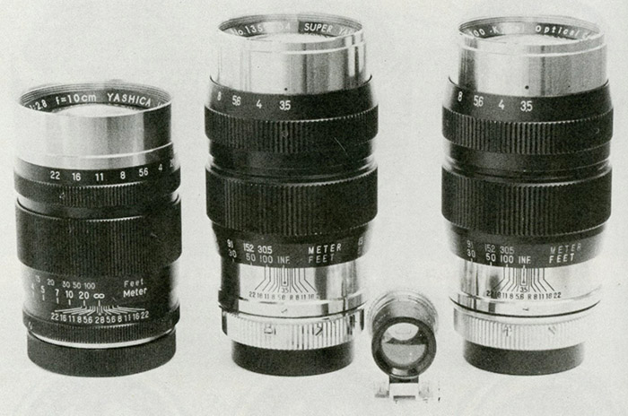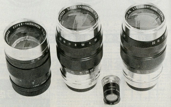 The photos below are from Mikio Awano's “Camera Collectors’ News” article and show different views top to bottom of lenses left to right; 10 cm Super-Yashinon, 13.5 cm Super Yashinon, Yashinon 13.5 cm finder and 135 mm Super-Acall.